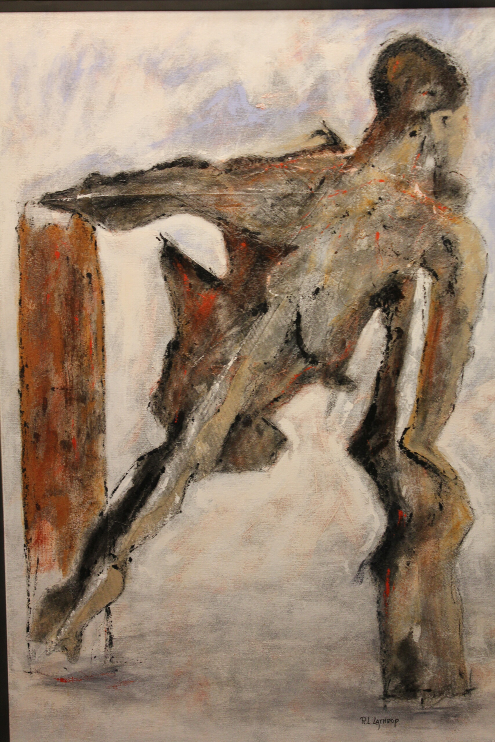 Explore ‘Broken Man,’ an evocative abstract acrylic painting by R.L. Lathrop. Showcasing a struggling man leaning on a stump for support, this artwork is available at Hedgewood Galleries in Connersville, Indiana. Serving all of Indiana and Ohio