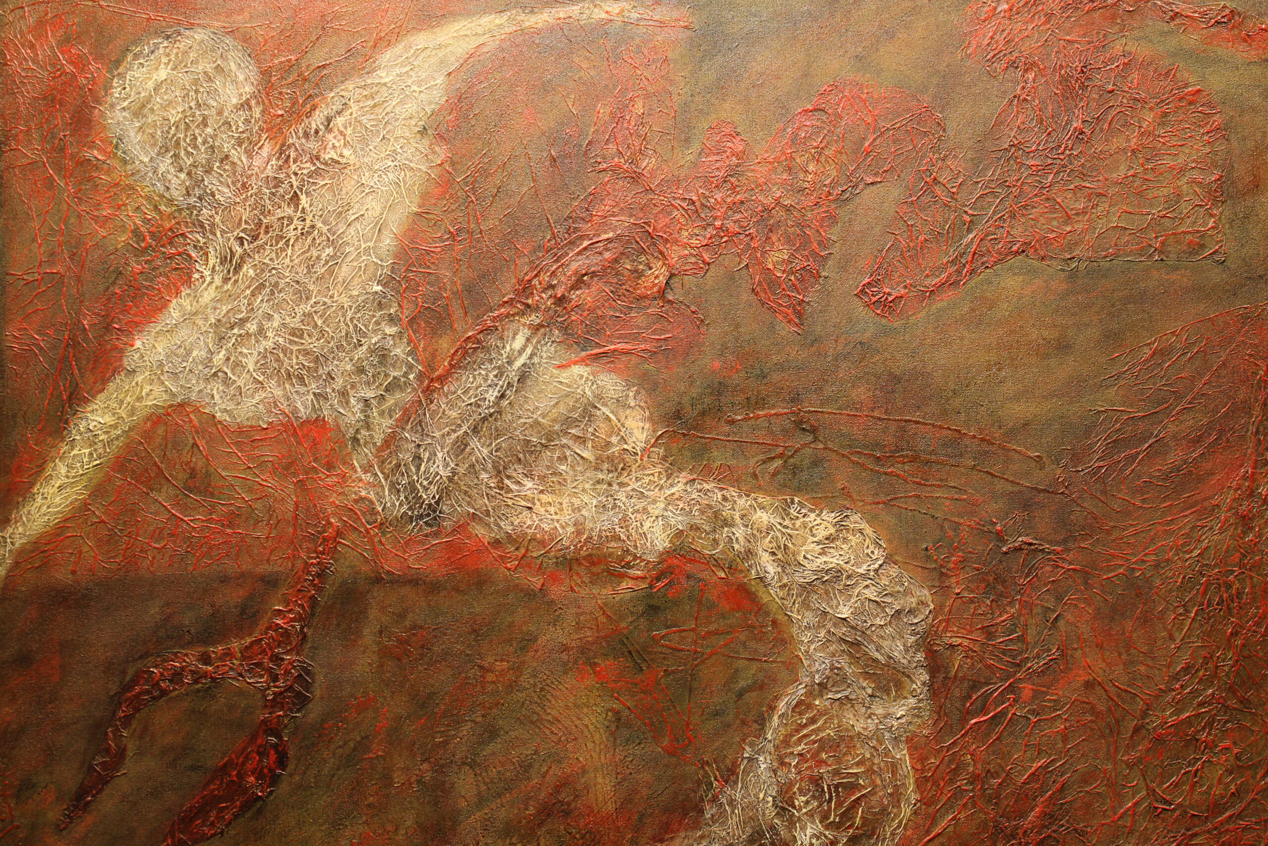 Explore ‘Pain,’ a powerful abstract acrylic painting by R.L. Lathrop, at Hedgewood Galleries in Connersville, Indiana. This emotional piece captures the raw intensity of human emotion with its vivid red tones. Serving art lovers across Indiana.