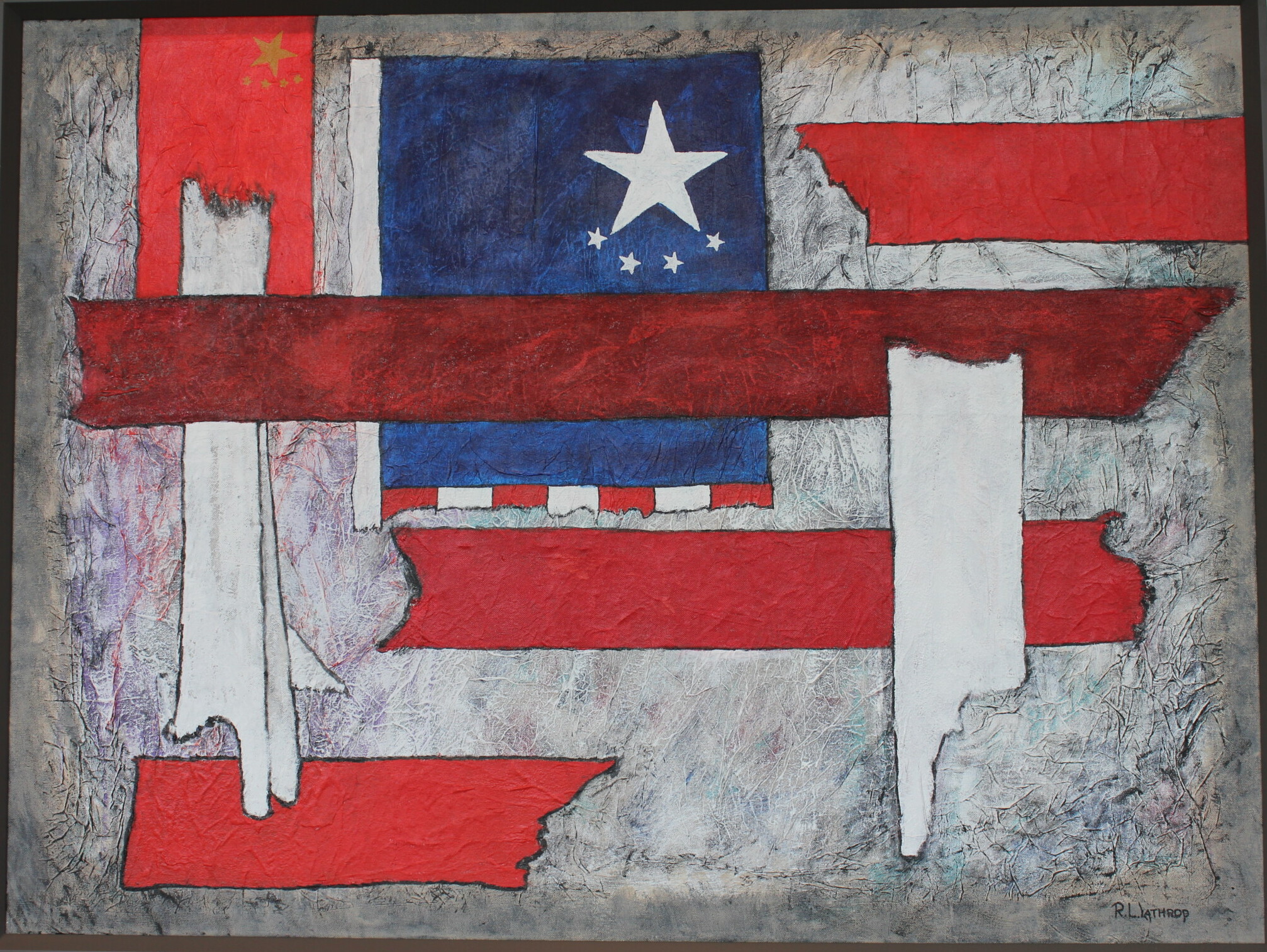 Discover ‘Traitor Joe’s USS of A,’ a striking political acrylic abstract artwork depicting two torn flags, symbolizing division and reflection. On display at Hedgewood Gallery in Connersville, Indiana. Serving art enthusiasts across Indiana, Hedgewood Gallery specializes in curated fine art and exhibitions.